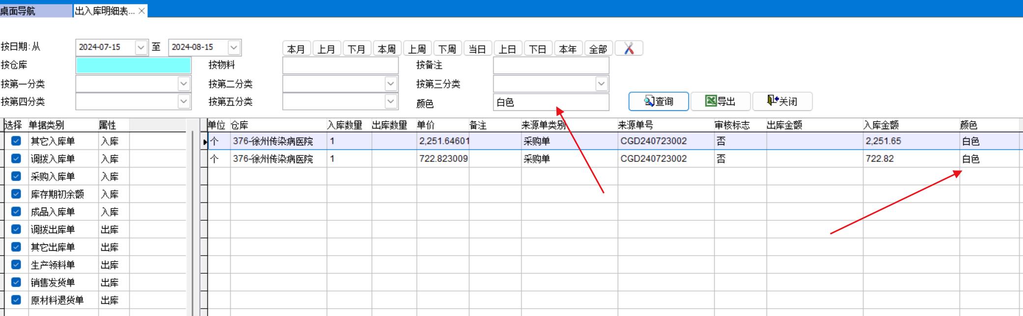 表格中白色是入庫(kù)單記錄,綠色是出庫(kù)單記錄