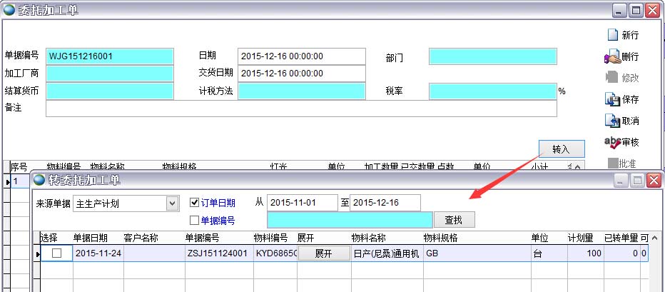 可以轉(zhuǎn)入客戶(hù)訂單、主生產(chǎn)計(jì)劃、委托加工申請(qǐng)單生成委托加工單