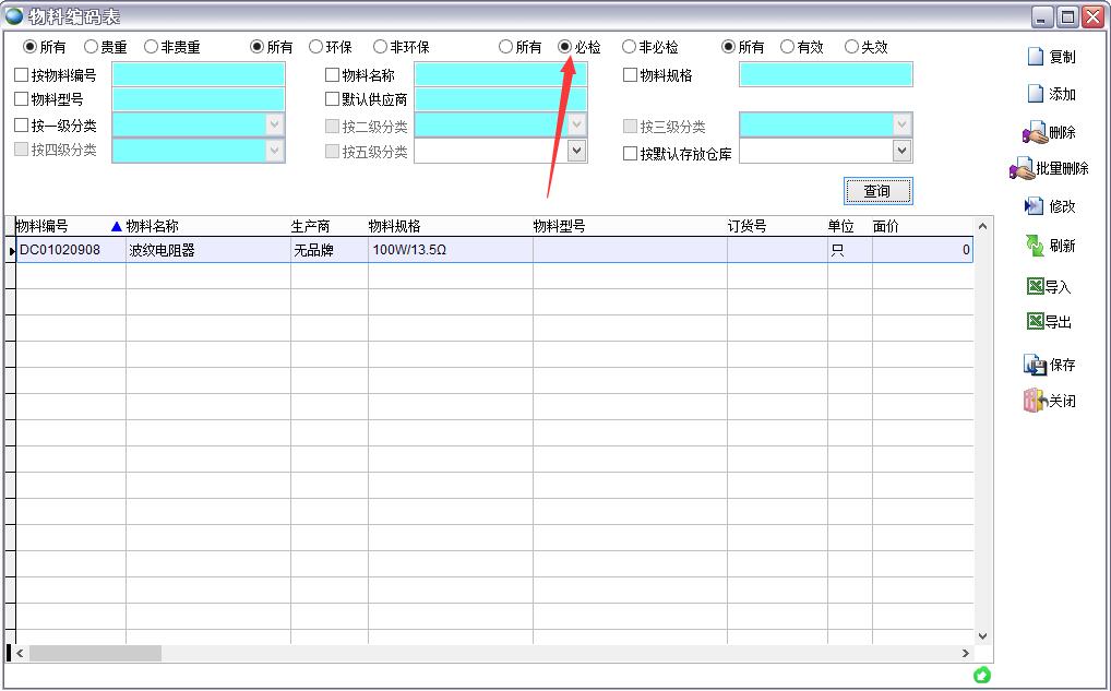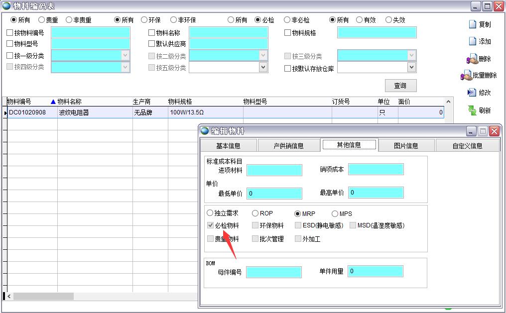 在物料編碼表中可以按必檢物料進行查詢所有可送檢的物料清單