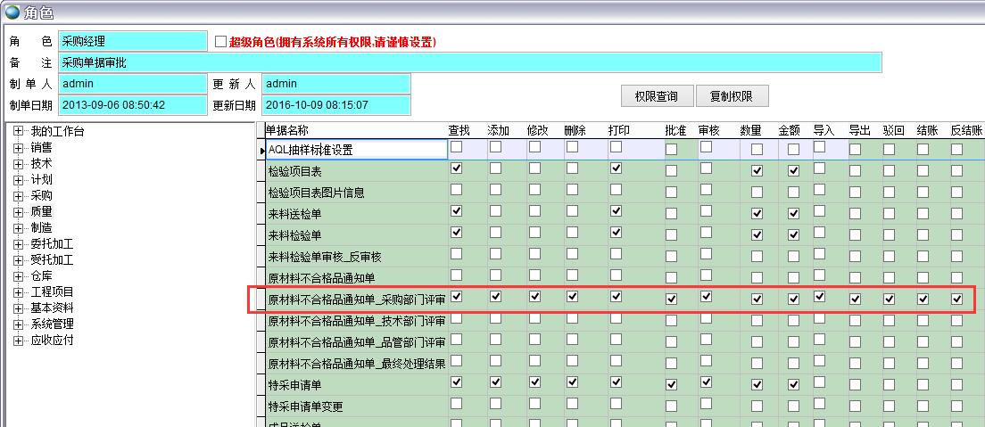 原材料不合格品通知單生成后需要經(jīng)過相關(guān)部門的評審,在權(quán)限設(shè)置中為相關(guān)部門開通單據(jù)的權(quán)限。