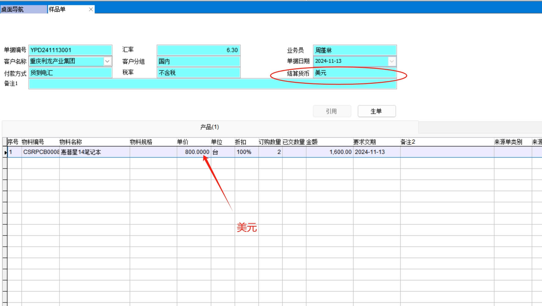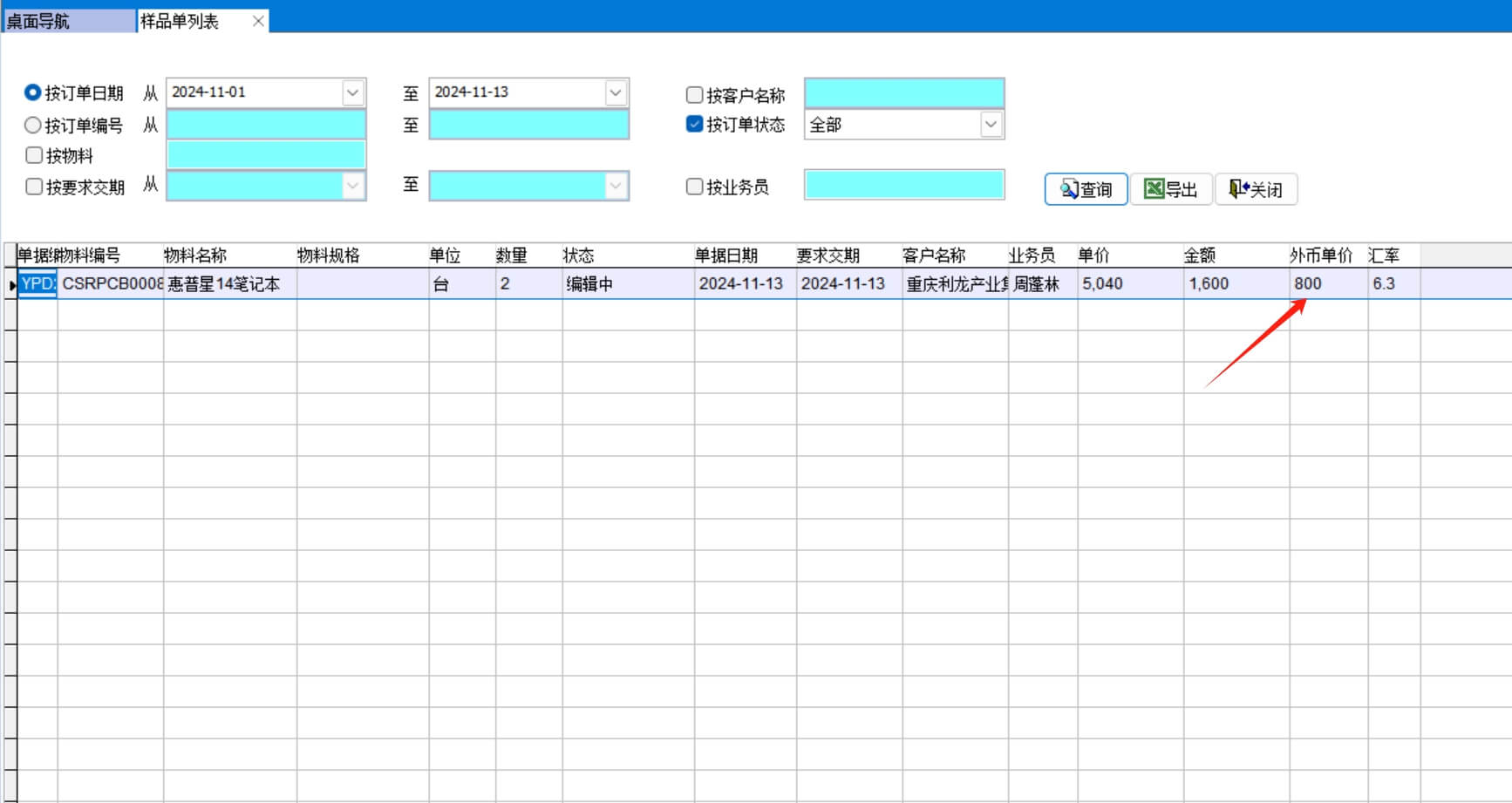 打開路徑:【主菜單】->【銷售】-> 【樣品單】