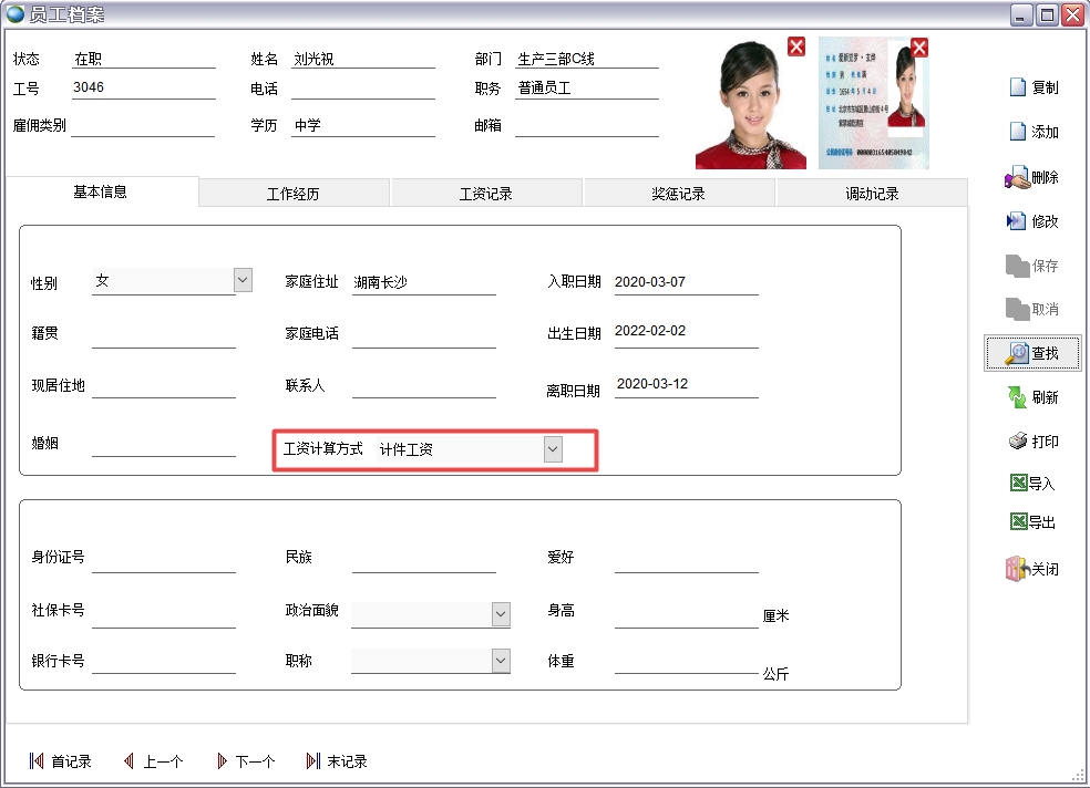 所有需要計算工資的員工都要錄入員工檔案信息,工資計算方式選擇計件工資或計時工資。
