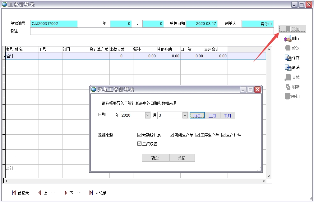新建工資計算表 上述數(shù)據(jù)都準備好后就可以做工資表。 1、添加 2、選擇年月、需要導入的單據(jù) 3、保存 4、導入后可以手工修改數(shù)據(jù),如果日薪員工有考勤記錄則日薪人員工資根據(jù)考勤天數(shù)和日工資計算得出?记谟涗泴υ滦絾T工無效,月薪員工的工資直接從工資設置中導入。