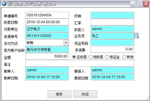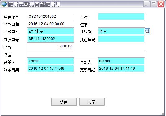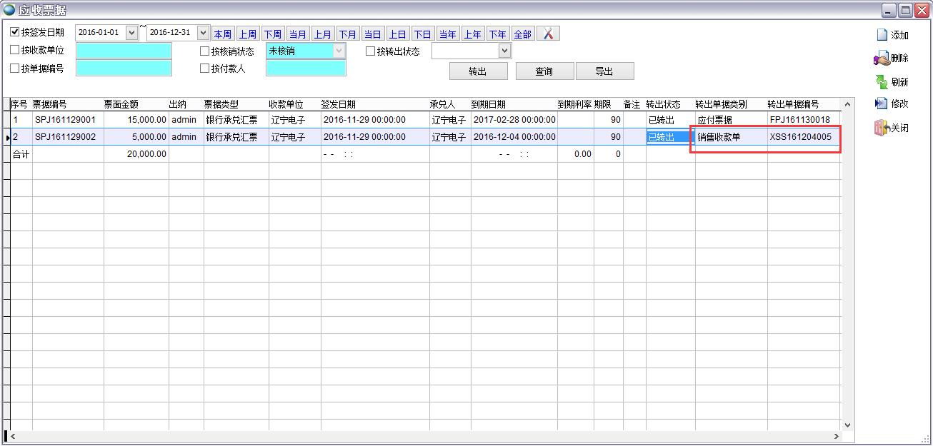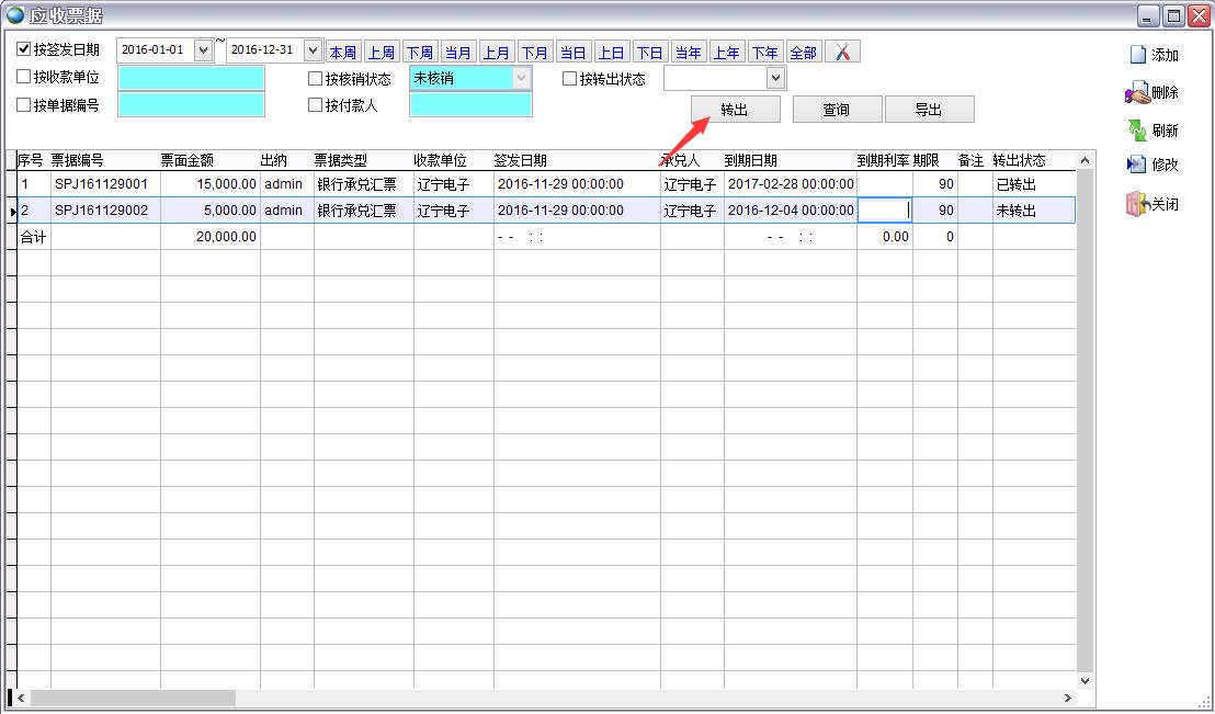 轉(zhuǎn)出 選擇一條記錄,點(diǎn)轉(zhuǎn)出 應(yīng)收票據(jù)到期后如果收到了款,則轉(zhuǎn)出為銷售收款單 沒收到款可轉(zhuǎn)為其他應(yīng)收單