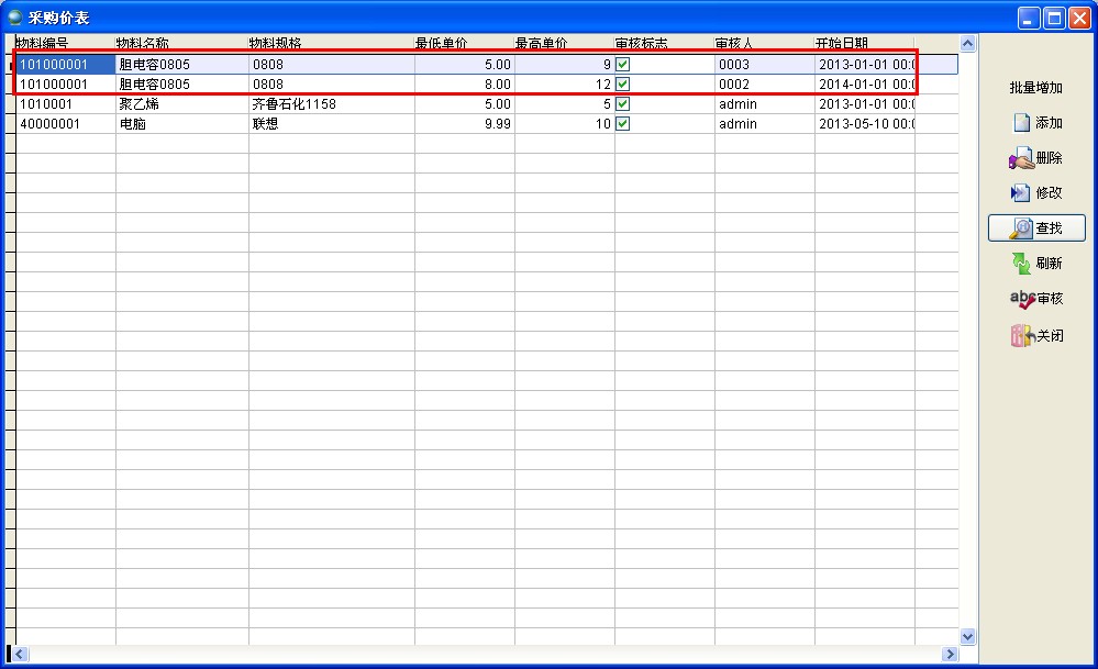 第三步,對采購的物料規(guī)定采購價格?梢詫ν粋物料在不同時間段規(guī)定不同價格。