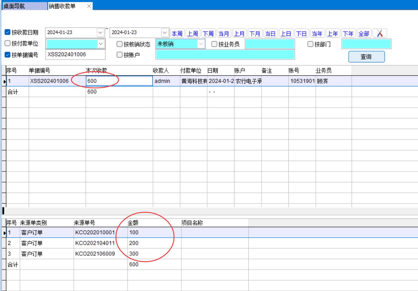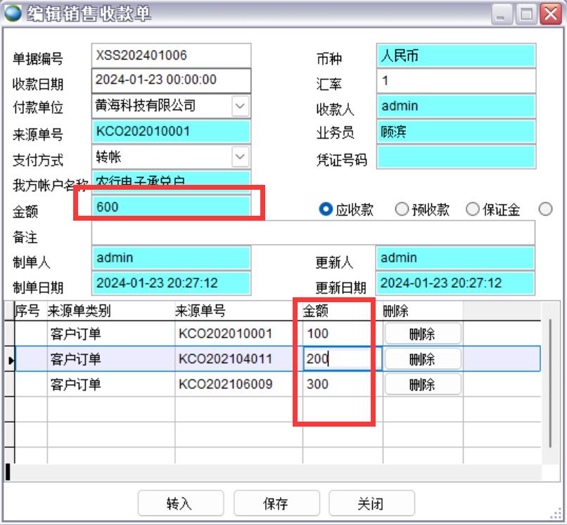 銷售收款單必須引用來(lái)源單據(jù),比如訂單金額1萬(wàn),現(xiàn)在預(yù)收50%,就引用客戶訂單做銷售收款單,這樣才能知道該訂單已經(jīng)收了50%了,還有50%未收。