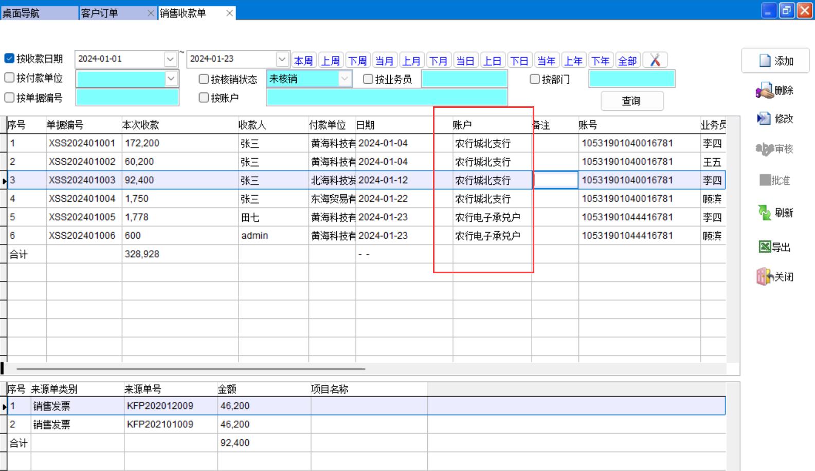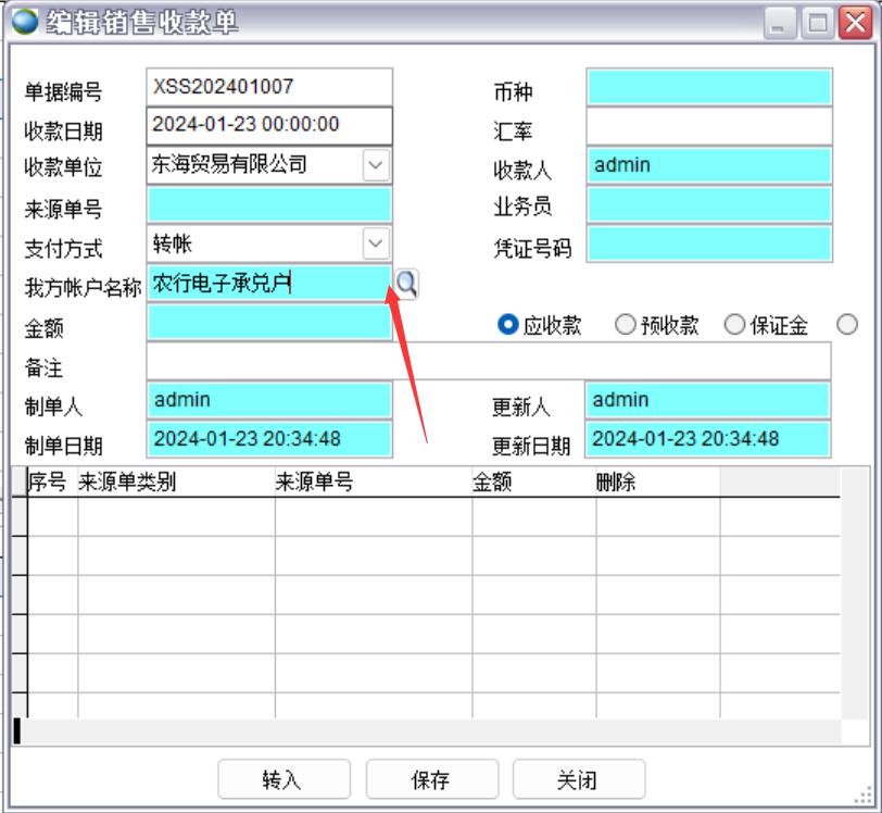 銷售收款單需要選擇收款賬戶