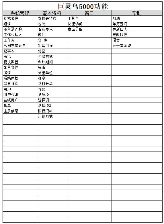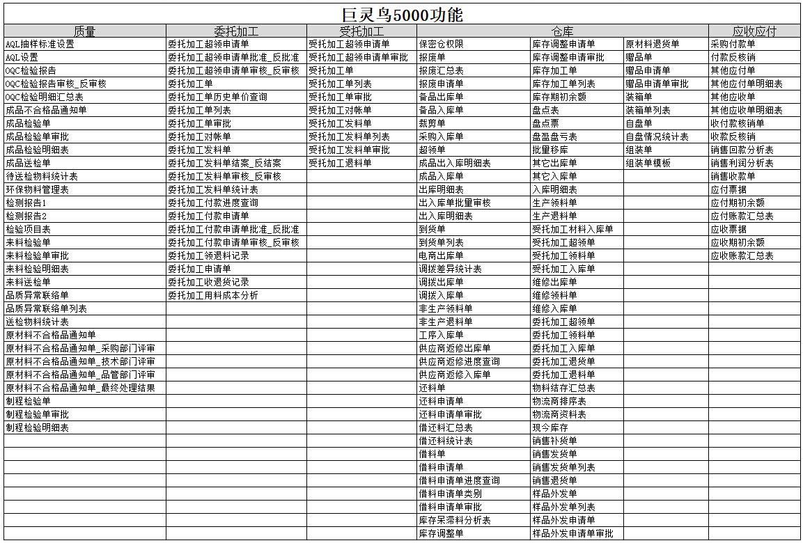 巨靈鳥5000模塊包括:銷售、采購、倉庫、委托加工、受托加工、質量、制造、計劃、系統(tǒng)管理、應收應付、基礎資料、技術完全有滿足在中小企業(yè)的生產管理需要。