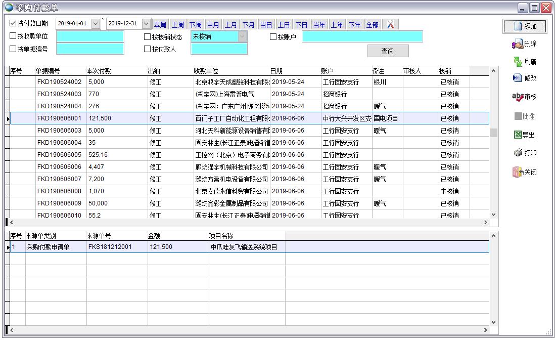 采購付款流程:采購單(采購員)->采購付款申請單(采購員制單,領導審核)->采購付款單(財務引用采購付款申請單)